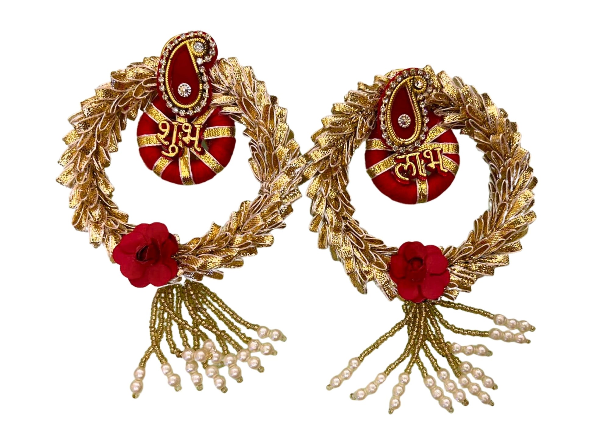 Elevate the ambiance of your home with our Frill Ring Shubh Labh wall hanging.\n\nCrafted with intricate frill designs and adorned with auspicious symbols, this piece exudes elegance and spirituality. The Shubh Labh inscription symbolizes prosperity and good fortune, making it an ideal addition to your home decor.\n\nWhether displayed in the living room, entrance, or puja room, this wall hanging radiates positivity and creates a serene atmosphere. It's perfect for auspicious occasions like weddings, festivals, or housewarmings, and also makes a thoughtful gift for loved ones.\n\nEmbrace the blessings and positivity with our Frill Ring Shubh Labh wall hanging, and let it bring joy and prosperity to your home.\n\n\n\n\n