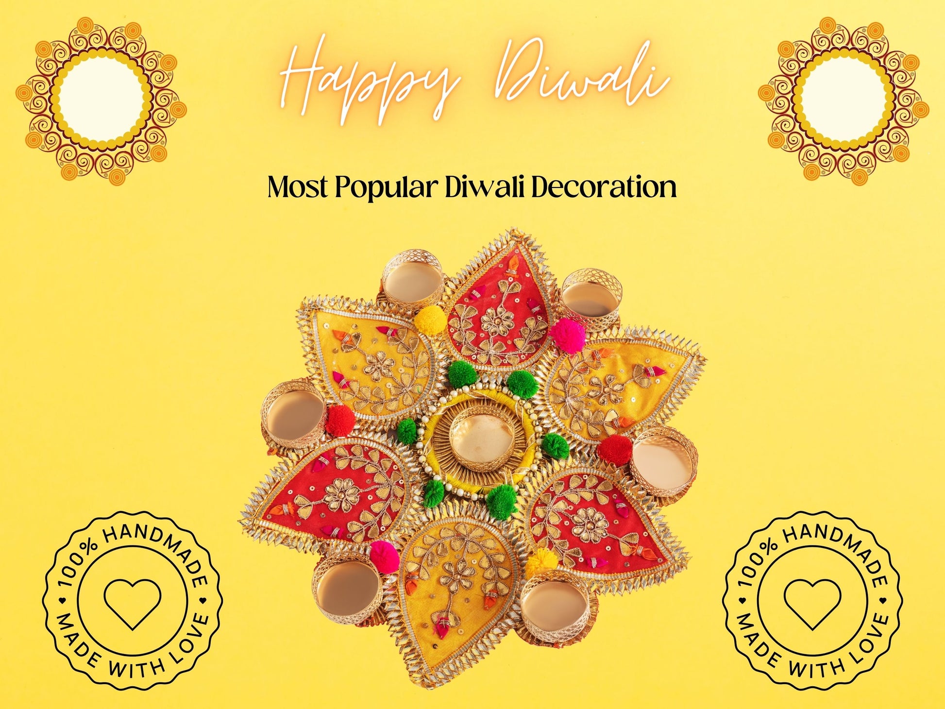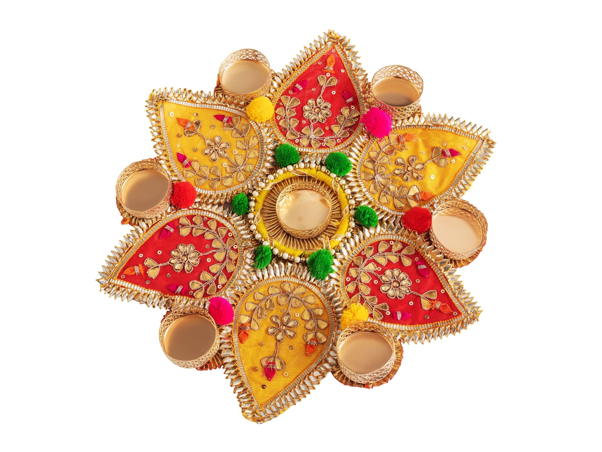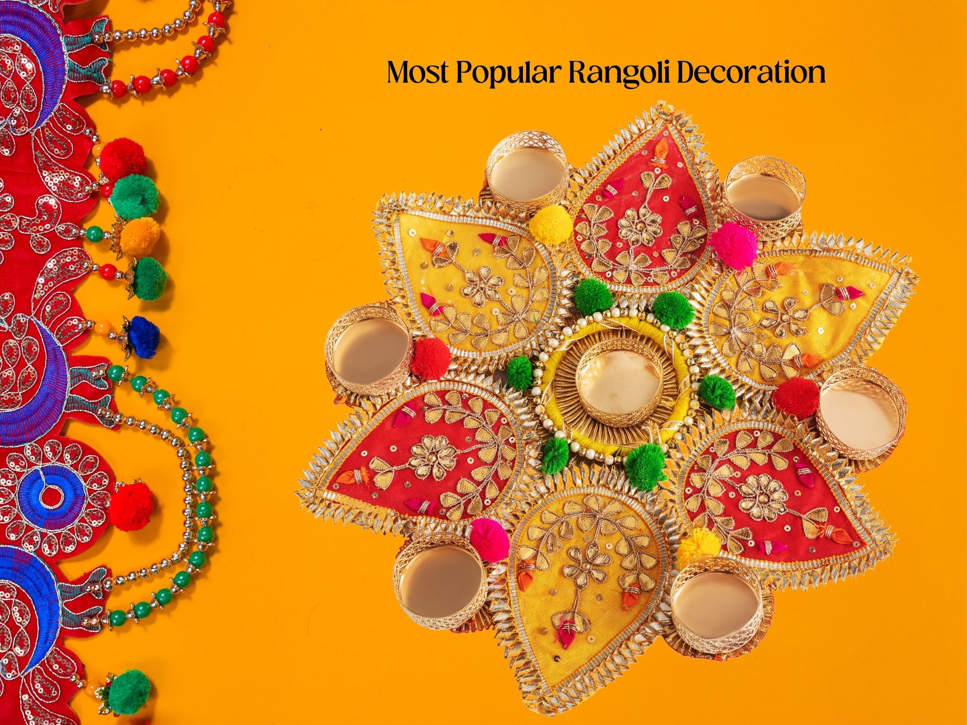 Enliven your living space with the vibrant charm of our Gota Pati Flower Rangoli.\n\nCrafted with meticulous attention to detail, each piece in this set features exquisite gota patti work combined with vibrant artificial flowers, creating a stunning visual display. The intricate designs and vibrant colors add a touch of traditional elegance to any room, making it perfect for festivals, weddings, and special occasions.\n\nThe Gota Pati Flower Rangoli set includes multiple pieces, allowing you to arrange them in various patterns and combinations to suit your decor style. Whether placed on the floor, tables, or walls, these rangolis create a festive ambiance and serve as a beautiful centerpiece for your home decor.\n\nSymbolizing joy, prosperity, and cultural richness, the Gota Pati Flower Rangoli holds deep significance in Indian traditions. It is believed to bring good luck and positive energy to the home, making it an essential element of festive celebrations.\n\nEmbrace the spirit of tradition and celebration with our Gota Pati Flower Rangoli. Whether adorning your living room, dining area, or entrance, this exquisite piece is sure to captivate your guests and create lasting memories of joyous occasions.