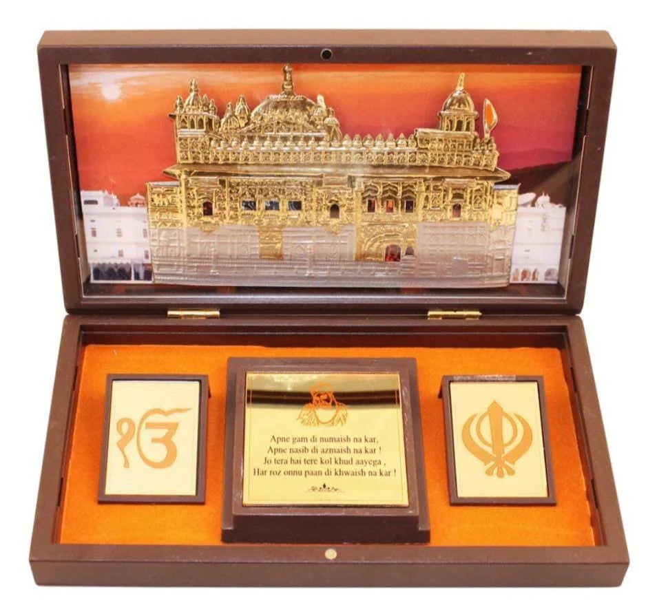 Welcome the divine presence into your spiritual space with the Waheguru Charan Paduka Box. This intricately crafted box is designed to hold the sacred footprints, symbolizing the revered journey of devotion and spirituality in Sikhism.\nThe Waheguru Charan Paduka Box is a profound addition to your Pooja room, creating an ambiance of reverence and grace. Crafted with meticulous detail, the box is adorned with symbols and motifs that pay homage to the divine energy encapsulated in the footprints.\nWhether you are establishing a home Gurdwara or seeking to enhance your connection with Waheguru, this box serves as a tangible representation of devotion. The compact and elegantly designed box ensures that the sacred footprints are housed with utmost respect and care.\nImmerse yourself in the spiritual vibrations as you open the Waheguru Charan Paduka Box during your prayers or moments of reflection. Its presence becomes a conduit for spiritual connection and a reminder of the divine path that one walks on.\nBring the essence of Waheguru into your sacred space with the Waheguru Charan Paduka Box – a symbol of devotion, humility, and the eternal journey toward enlightenment. This box not only holds the sacred footprints but also embodies the spiritual journey of those who seek to connect with the divine presence of Waheguru.\n